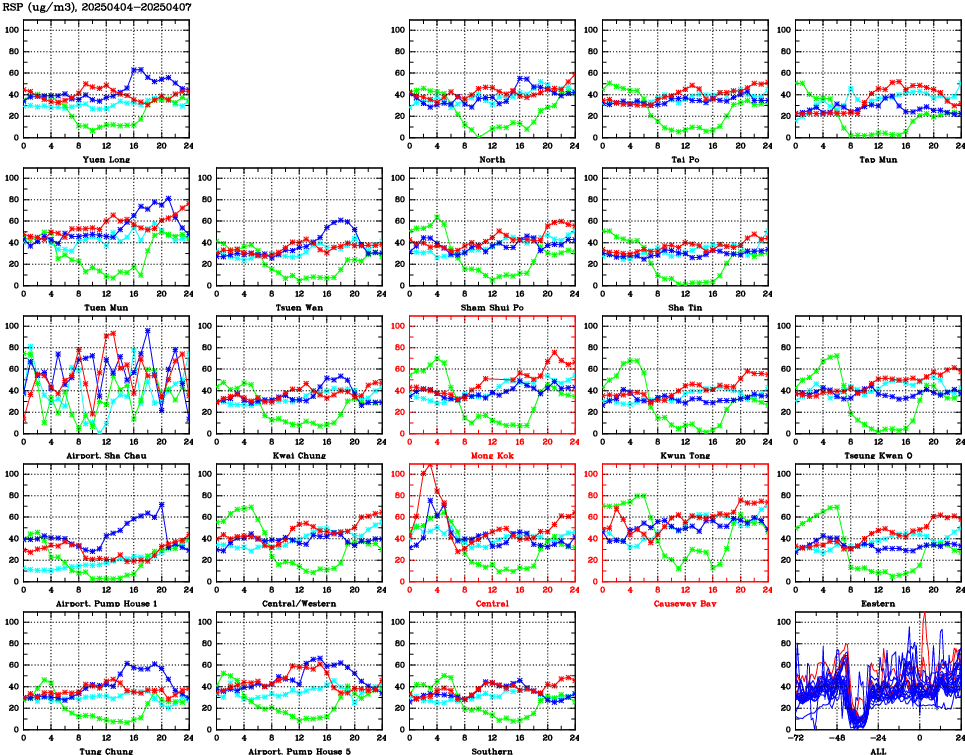 | Air Quality Data Time Series for RSP (2025/04/07) | ( Line colors: Day -3 Day -2 Day -1 Current day ) | 2D Map Current AQHI |