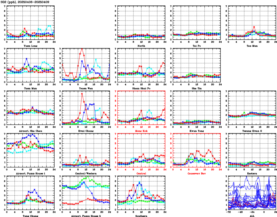 | Air Quality Data Time Series for SO2 (2025/04/09) | ( Line colors: Day -3 Day -2 Day -1 Current day ) | 2D Map Current AQHI |