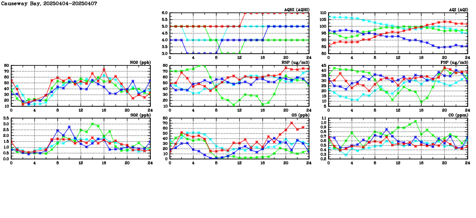 | Air Quality Data Time Series in Causeway Bay (2025/04/07) | ( Line colors: Day -3 Day -2 Day -1 Current day ) | 2D Map Current AQHI |