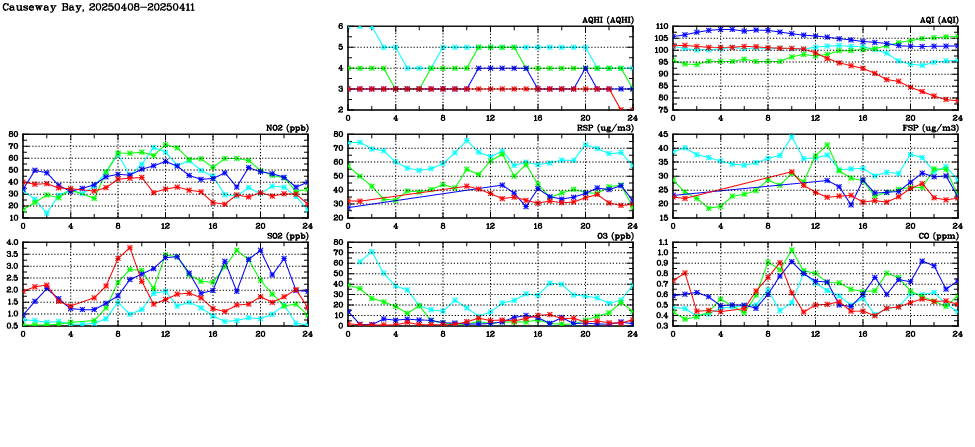 | Air Quality Data Time Series in Causeway Bay (2025/04/11) | ( Line colors: Day -3 Day -2 Day -1 Current day ) | 2D Map Current AQHI |