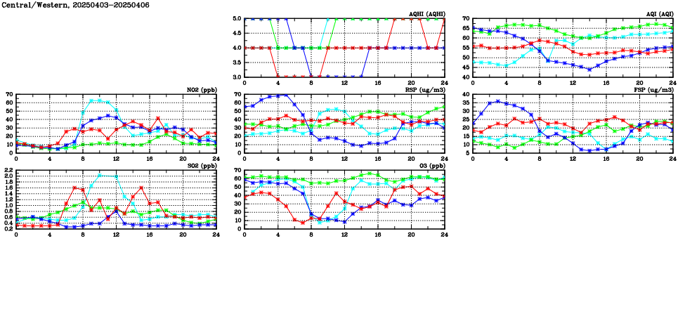 | Air Quality Data Time Series in Central/Western (2025/04/06) | ( Line colors: Day -3 Day -2 Day -1 Current day ) | 2D Map Current AQHI |