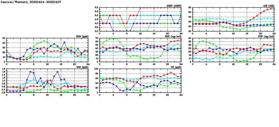 | Air Quality Data Time Series in Central/Western (2025/04/07) | ( Line colors: Day -3 Day -2 Day -1 Current day ) | 2D Map Current AQHI |