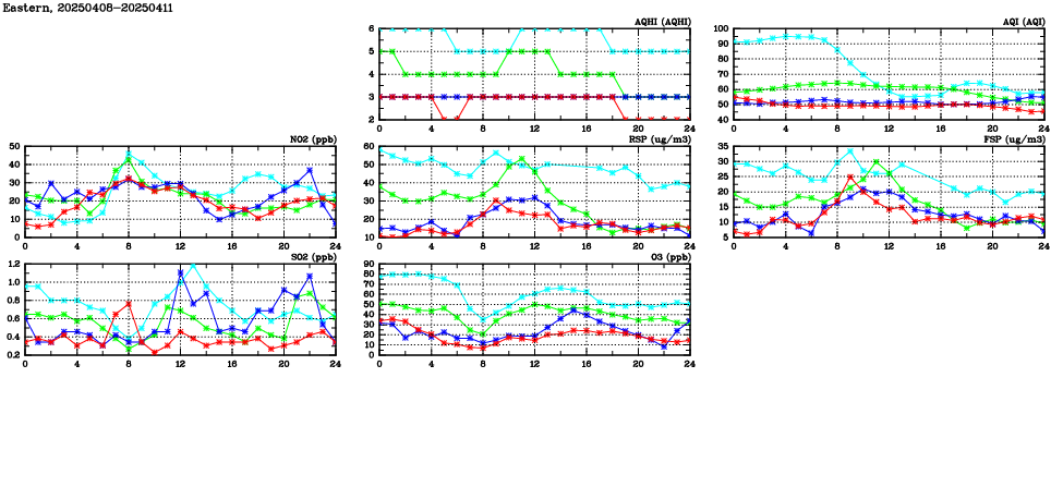 | Air Quality Data Time Series in Eastern (2025/04/11) | ( Line colors: Day -3 Day -2 Day -1 Current day ) | 2D Map Current AQHI |