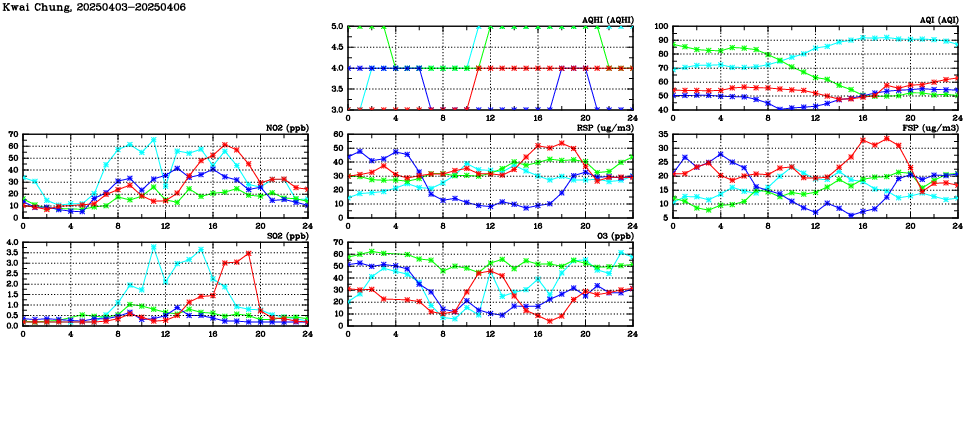 | Air Quality Data Time Series in Kwai Chung (2025/04/06) | ( Line colors: Day -3 Day -2 Day -1 Current day ) | 2D Map Current AQHI |