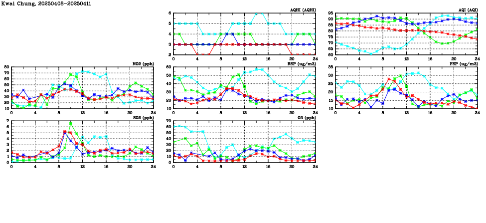 | Air Quality Data Time Series in Kwai Chung (2025/04/11) | ( Line colors: Day -3 Day -2 Day -1 Current day ) | 2D Map Current AQHI |