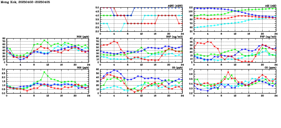 | Air Quality Data Time Series in Mong Kok (2025/04/05) | ( Line colors: Day -3 Day -2 Day -1 Current day ) | 2D Map Current AQHI |