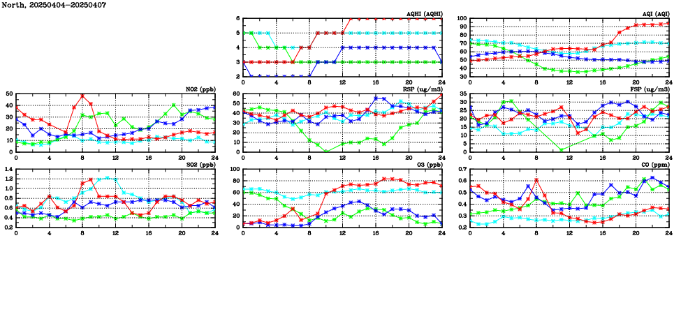 | Air Quality Data Time Series in North (2025/04/07) | ( Line colors: Day -3 Day -2 Day -1 Current day ) | 2D Map Current AQHI |