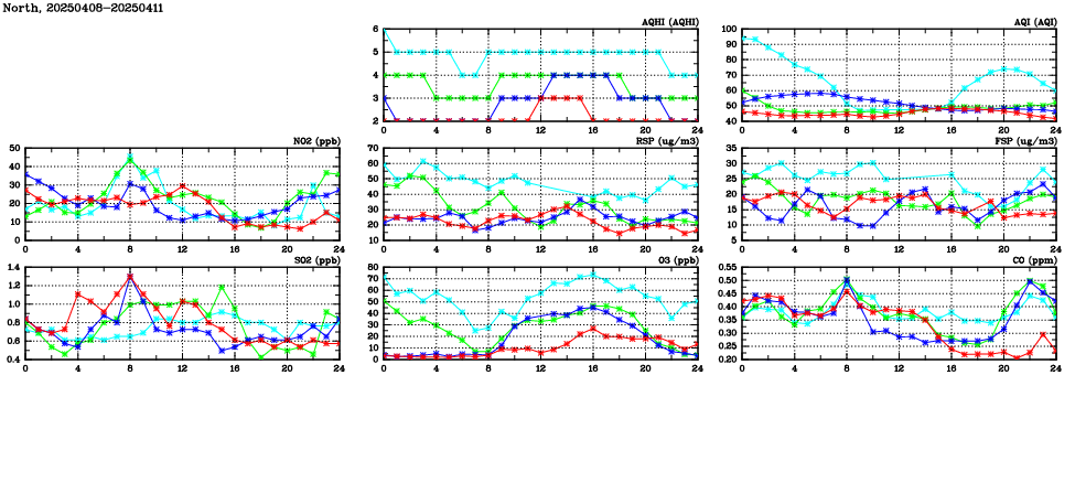 | Air Quality Data Time Series in North (2025/04/11) | ( Line colors: Day -3 Day -2 Day -1 Current day ) | 2D Map Current AQHI |