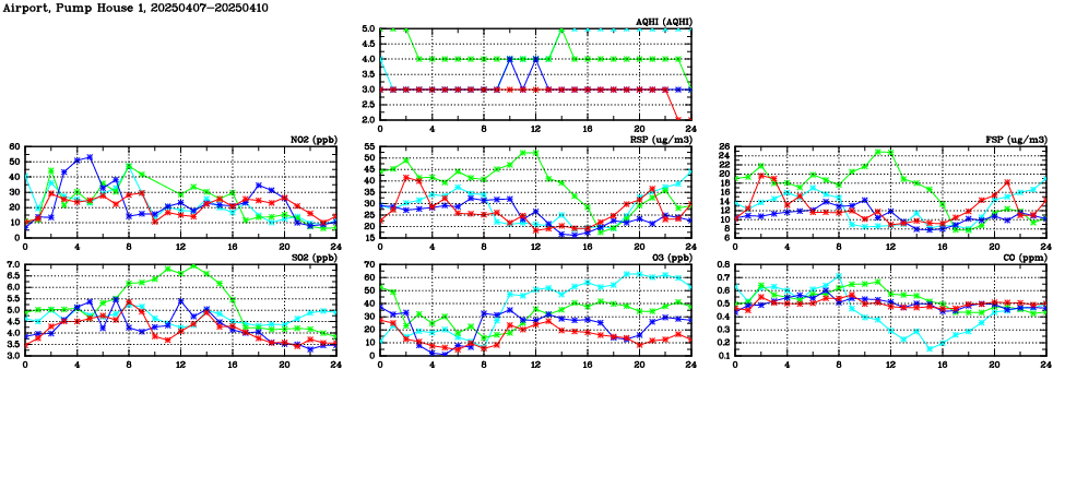 | Air Quality Data Time Series in Airport, Pump House 1 (2025/04/10) | ( Line colors: Day -3 Day -2 Day -1 Current day ) | 2D Map Current AQHI |