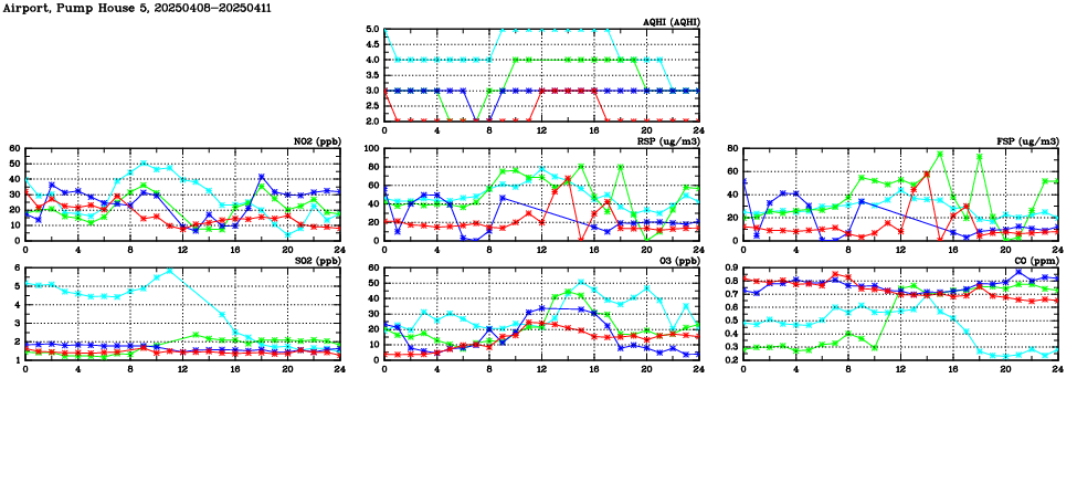| Air Quality Data Time Series in Airport, Pump House 5 (2025/04/11) | ( Line colors: Day -3 Day -2 Day -1 Current day ) | 2D Map Current AQHI |
