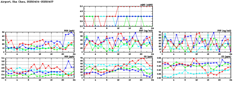 | Air Quality Data Time Series in Airport, Sha Chau (2025/04/07) | ( Line colors: Day -3 Day -2 Day -1 Current day ) | 2D Map Current AQHI |