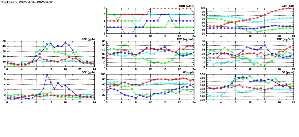 | Air Quality Data Time Series in Southern (2025/04/07) | ( Line colors: Day -3 Day -2 Day -1 Current day ) | 2D Map Current AQHI |