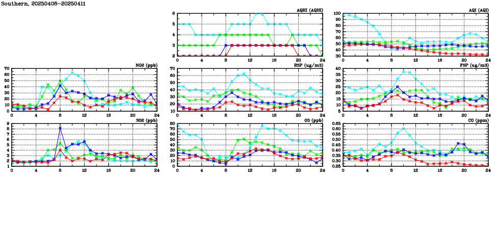 | Air Quality Data Time Series in Southern (2025/04/11) | ( Line colors: Day -3 Day -2 Day -1 Current day ) | 2D Map Current AQHI |