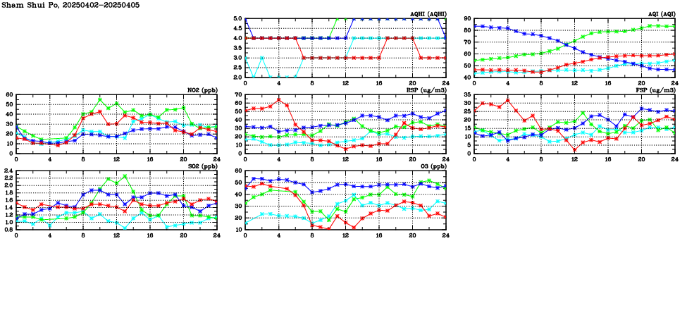 | Air Quality Data Time Series in Sham Shui Po (2025/04/05) | ( Line colors: Day -3 Day -2 Day -1 Current day ) | 2D Map Current AQHI |