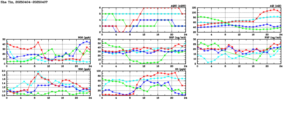 | Air Quality Data Time Series in Sha Tin (2025/04/07) | ( Line colors: Day -3 Day -2 Day -1 Current day ) | 2D Map Current AQHI |