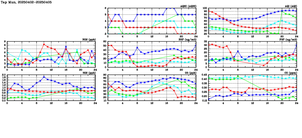 | Air Quality Data Time Series in Tap Mun (2025/04/05) | ( Line colors: Day -3 Day -2 Day -1 Current day ) | 2D Map Current AQHI |