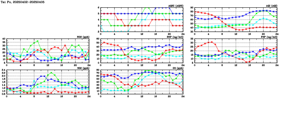 | Air Quality Data Time Series in Tai Po (2025/04/05) | ( Line colors: Day -3 Day -2 Day -1 Current day ) | 2D Map Current AQHI |