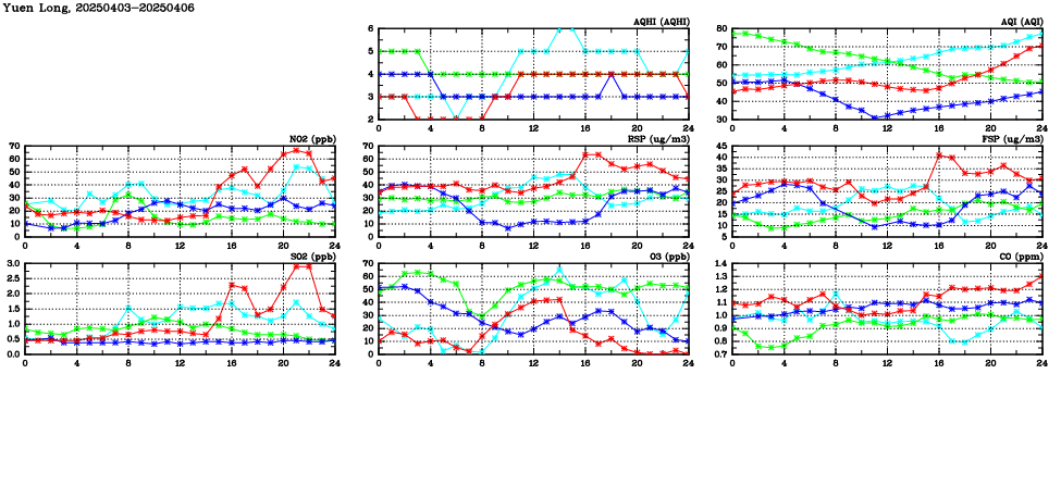 | Air Quality Data Time Series in Yuen Long (2025/04/06) | ( Line colors: Day -3 Day -2 Day -1 Current day ) | 2D Map Current AQHI |