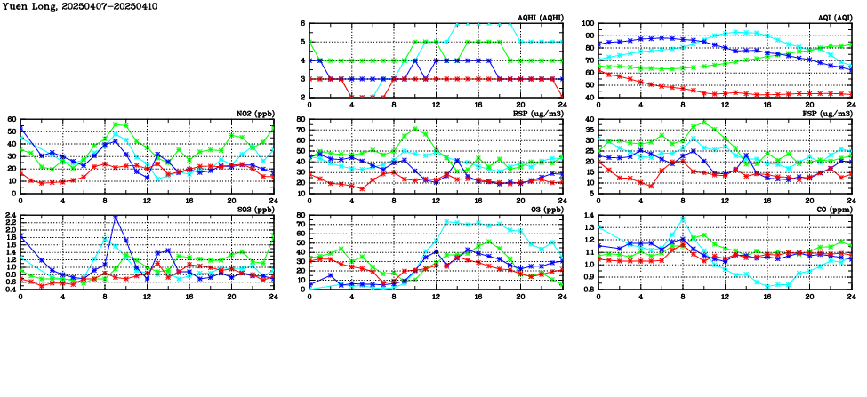 | Air Quality Data Time Series in Yuen Long (2025/04/10) | ( Line colors: Day -3 Day -2 Day -1 Current day ) | 2D Map Current AQHI |