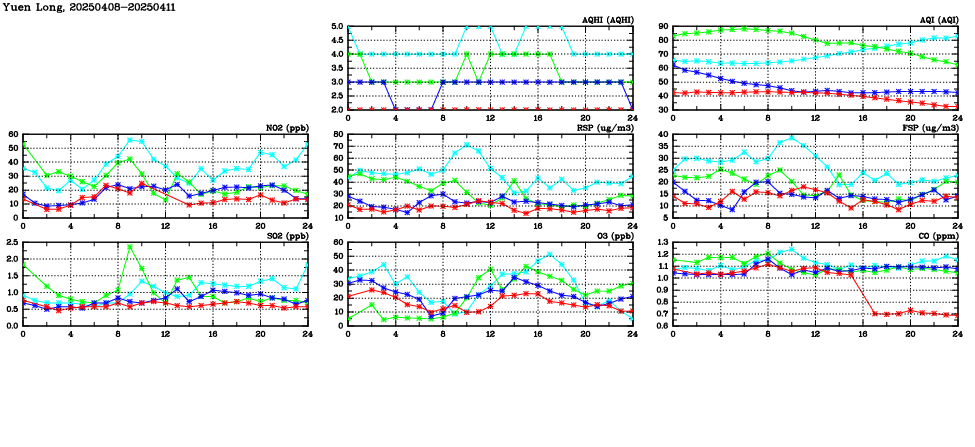 | Air Quality Data Time Series in Yuen Long (2025/04/11) | ( Line colors: Day -3 Day -2 Day -1 Current day ) | 2D Map Current AQHI |