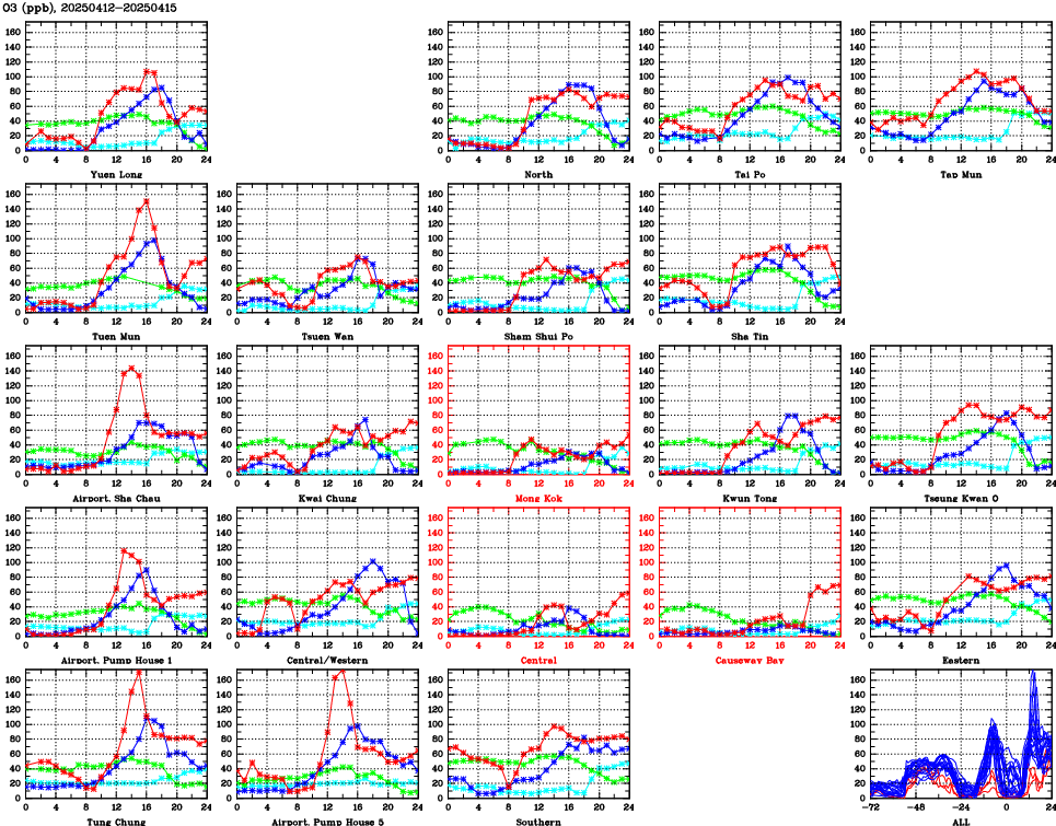 | Air Quality Data Time Series for O3 (2025/04/15) | ( Line colors: Day -3 Day -2 Day -1 Current day ) | 2D Map Current AQHI |