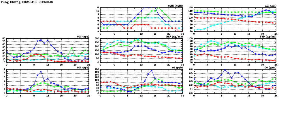 | Air Quality Data Time Series in Tung Chung (2025/04/16) | ( Line colors: Day -3 Day -2 Day -1 Current day ) | 2D Map Current AQHI |