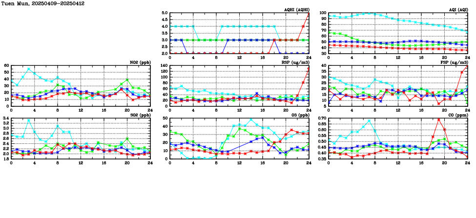 | Air Quality Data Time Series in Tuen Mun (2025/04/12) | ( Line colors: Day -3 Day -2 Day -1 Current day ) | 2D Map Current AQHI |