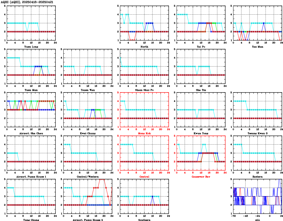 | Air Quality Data Time Series for AQHI (2025/04/21) | ( Line colors: Day -3 Day -2 Day -1 Current day ) | 2D Map Current AQHI |