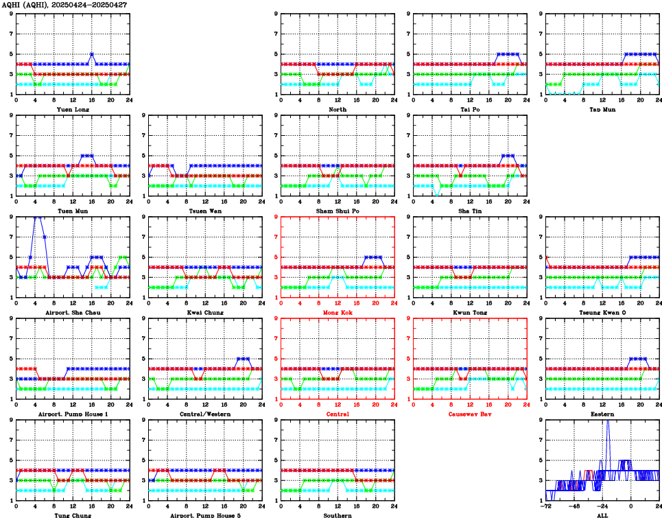 | Air Quality Data Time Series for AQHI (2025/04/27) | ( Line colors: Day -3 Day -2 Day -1 Current day ) | 2D Map Current AQHI |