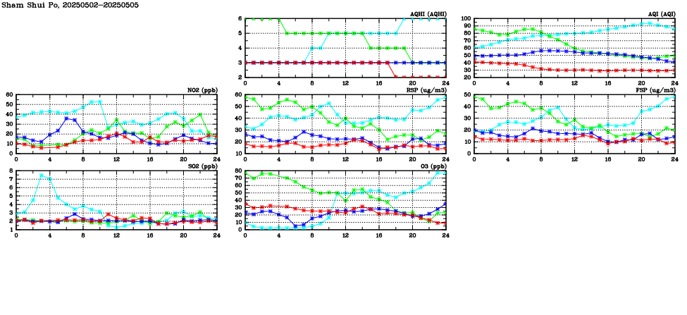 | Air Quality Data Time Series in Sham Shui Po (2025/05/05) | ( Line colors: Day -3 Day -2 Day -1 Current day ) | 2D Map Current AQHI |