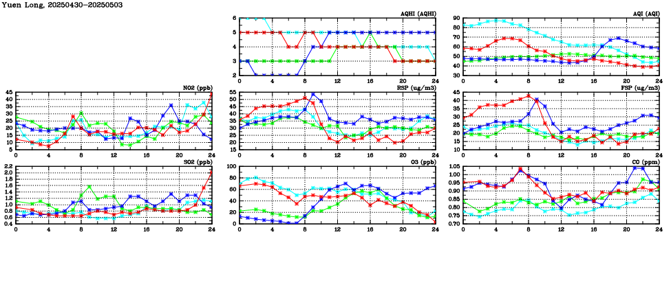 | Air Quality Data Time Series in Yuen Long (2025/05/03) | ( Line colors: Day -3 Day -2 Day -1 Current day ) | 2D Map Current AQHI |
