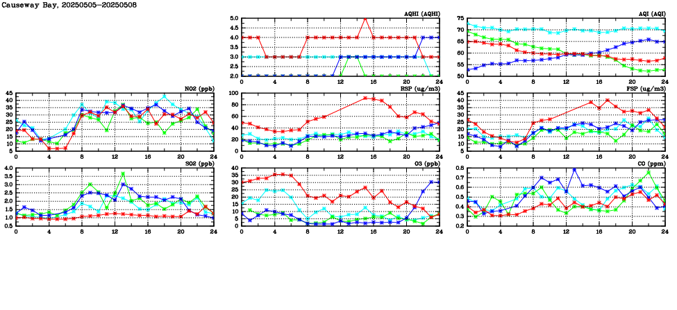 | Air Quality Data Time Series in Causeway Bay (2025/05/08) | ( Line colors: Day -3 Day -2 Day -1 Current day ) | 2D Map Current AQHI |