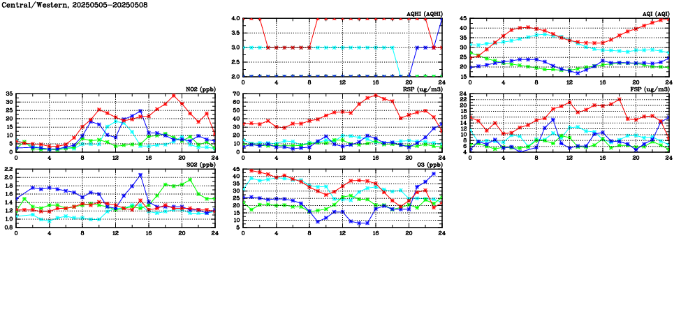 | Air Quality Data Time Series in Central/Western (2025/05/08) | ( Line colors: Day -3 Day -2 Day -1 Current day ) | 2D Map Current AQHI |