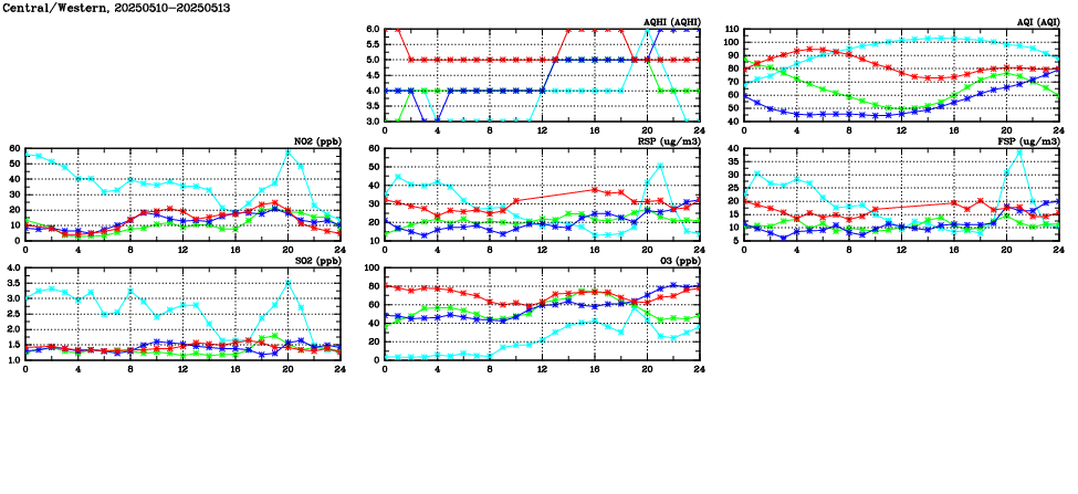 | Air Quality Data Time Series in Central/Western (2025/05/13) | ( Line colors: Day -3 Day -2 Day -1 Current day ) | 2D Map Current AQHI |