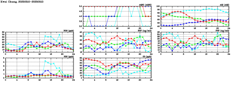 | Air Quality Data Time Series in Kwai Chung (2025/05/13) | ( Line colors: Day -3 Day -2 Day -1 Current day ) | 2D Map Current AQHI |