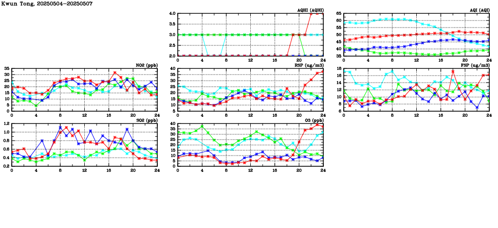 | Air Quality Data Time Series in Kwun Tong (2025/05/07) | ( Line colors: Day -3 Day -2 Day -1 Current day ) | 2D Map Current AQHI |
