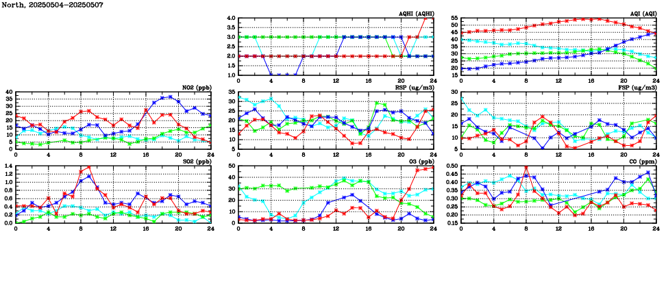 | Air Quality Data Time Series in North (2025/05/07) | ( Line colors: Day -3 Day -2 Day -1 Current day ) | 2D Map Current AQHI |