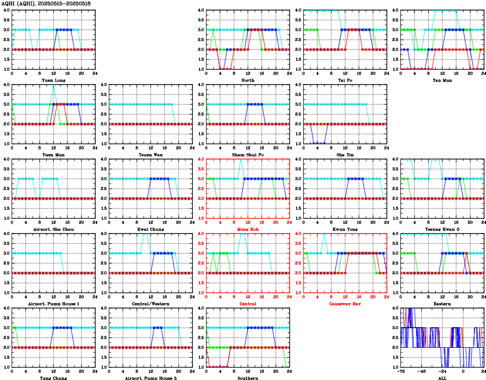 | Air Quality Data Time Series for AQHI (2025/05/18) | ( Line colors: Day -3 Day -2 Day -1 Current day ) | 2D Map Current AQHI |