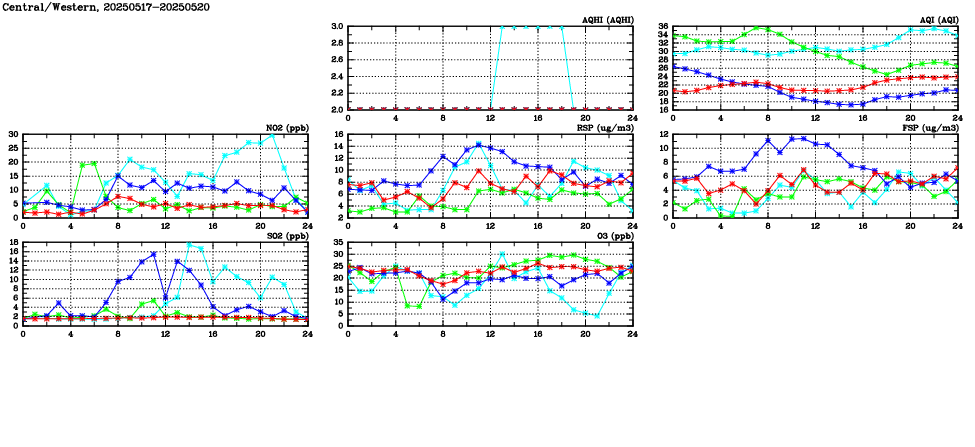 | Air Quality Data Time Series in Central/Western (2025/05/20) | ( Line colors: Day -3 Day -2 Day -1 Current day ) | 2D Map Current AQHI |