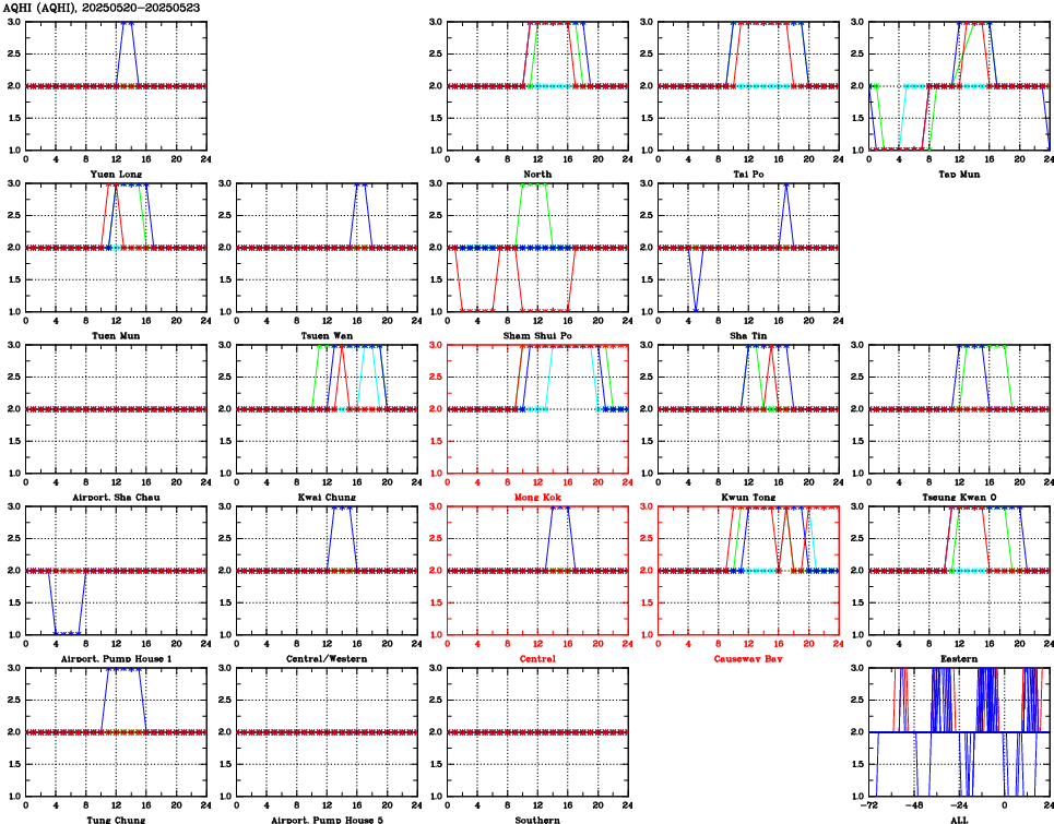 | Air Quality Data Time Series for AQHI (2025/05/23) | ( Line colors: Day -3 Day -2 Day -1 Current day ) | 2D Map Current AQHI |