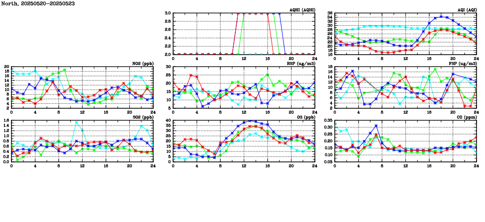 | Air Quality Data Time Series in North (2025/05/23) | ( Line colors: Day -3 Day -2 Day -1 Current day ) | 2D Map Current AQHI |