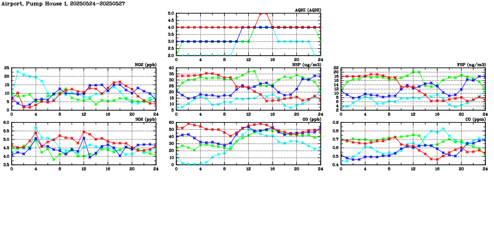 | Air Quality Data Time Series in Airport, Pump House 1 (2025/05/27) | ( Line colors: Day -3 Day -2 Day -1 Current day ) | 2D Map Current AQHI |