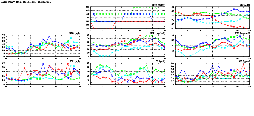| Air Quality Data Time Series in Causeway Bay (2025/06/02) | ( Line colors: Day -3 Day -2 Day -1 Current day ) | 2D Map Current AQHI |