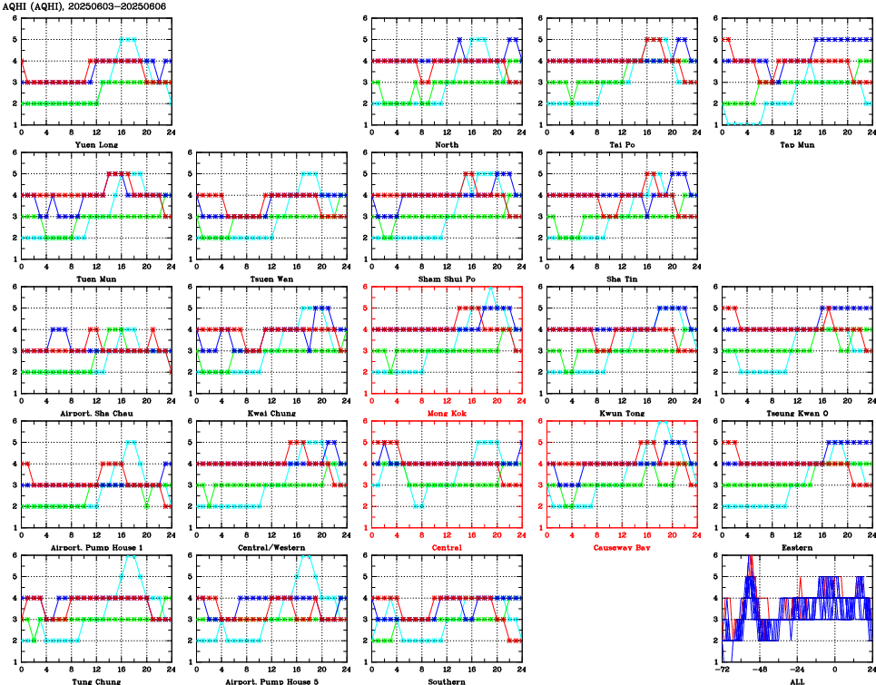| Air Quality Data Time Series for AQHI (2025/06/06) | ( Line colors: Day -3 Day -2 Day -1 Current day ) | 2D Map Current AQHI |