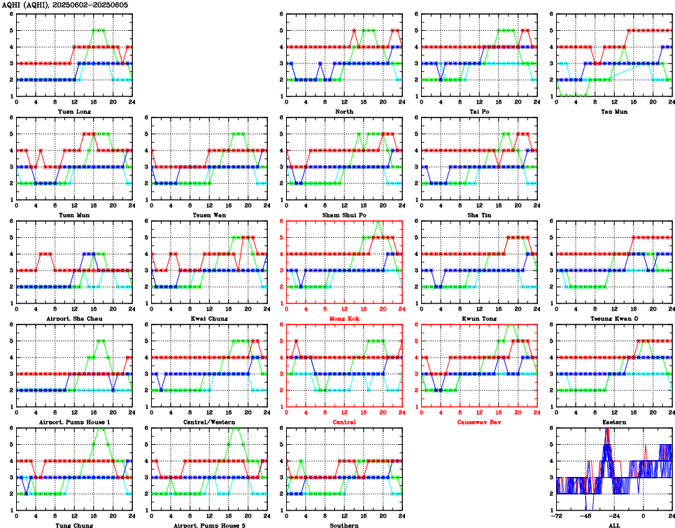 | Air Quality Data Time Series for AQHI (2025/06/05) | ( Line colors: Day -3 Day -2 Day -1 Current day ) | 2D Map Current AQHI |