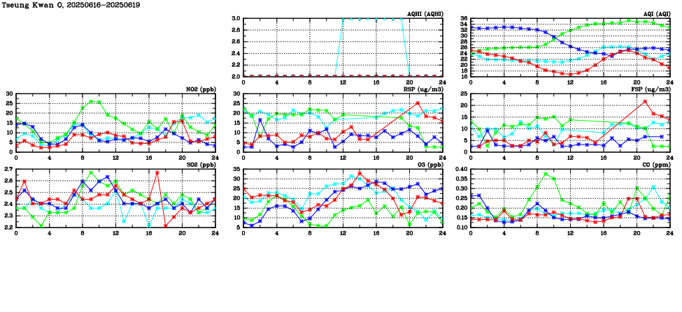 | Air Quality Data Time Series in Tseung Kwan O (2025/06/19) | ( Line colors: Day -3 Day -2 Day -1 Current day ) | 2D Map Current AQHI |