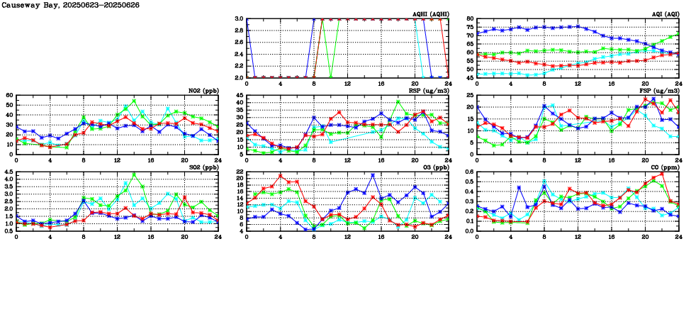 | Air Quality Data Time Series in Causeway Bay (2025/06/26) | ( Line colors: Day -3 Day -2 Day -1 Current day ) | 2D Map Current AQHI |