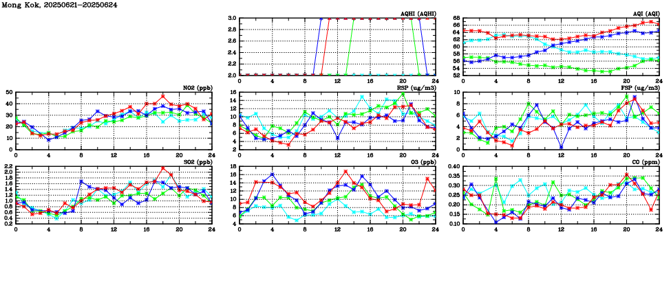 | Air Quality Data Time Series in Mong Kok (2025/06/24) | ( Line colors: Day -3 Day -2 Day -1 Current day ) | 2D Map Current AQHI |