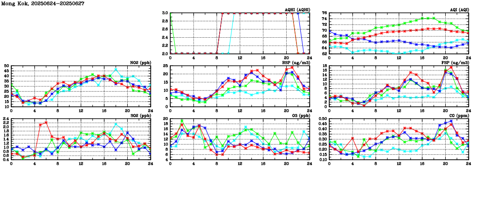 | Air Quality Data Time Series in Mong Kok (2025/06/27) | ( Line colors: Day -3 Day -2 Day -1 Current day ) | 2D Map Current AQHI |