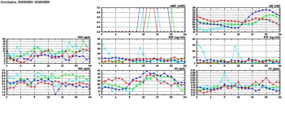 | Air Quality Data Time Series in Southern (2025/06/26) | ( Line colors: Day -3 Day -2 Day -1 Current day ) | 2D Map Current AQHI |